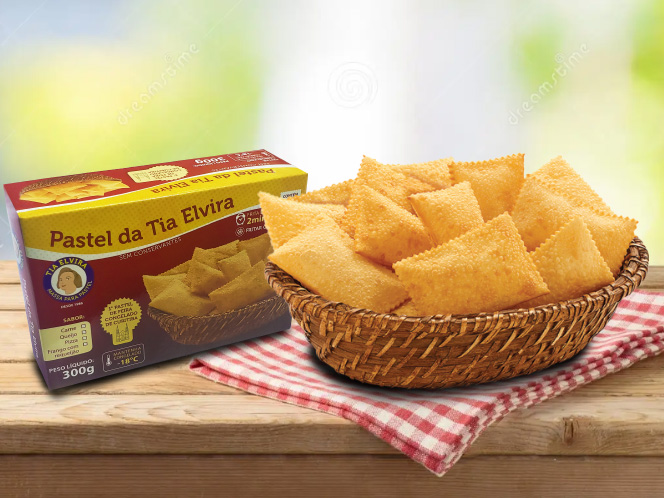 Pastel congelado no modelo "Porção de Pastel" (10cm x 7cm).